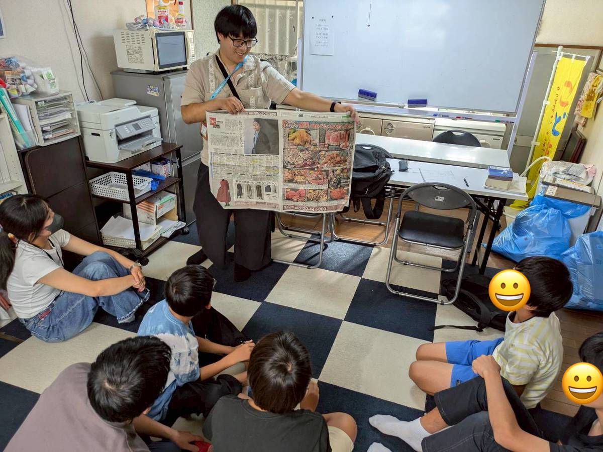 学習時間、子どもも多いがチューターも充実、しかも多彩! 入場曲(?)に『青と夏』が似合いそうなフレッシュ高校生から、背中で『ルビーの指環』を語れそうな世代まで、ろうにゃくにゃんにょ勢揃いです(早口苦手)。会場が一蘭のカウンターでも成立しそうな個別体制で子ども達に相対しました。