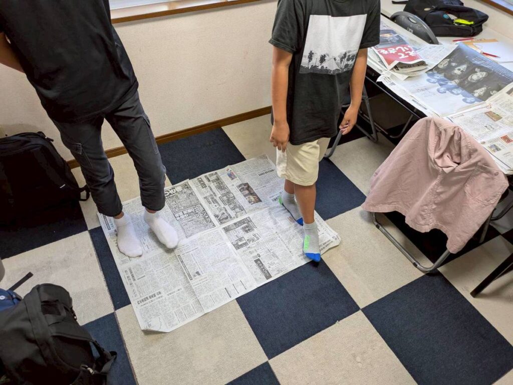 新聞紙を使った簡単なゲームを通して、そういった意思疎通の基礎を体験します。いや、したはずなんです。後から写真で様子を見ても。